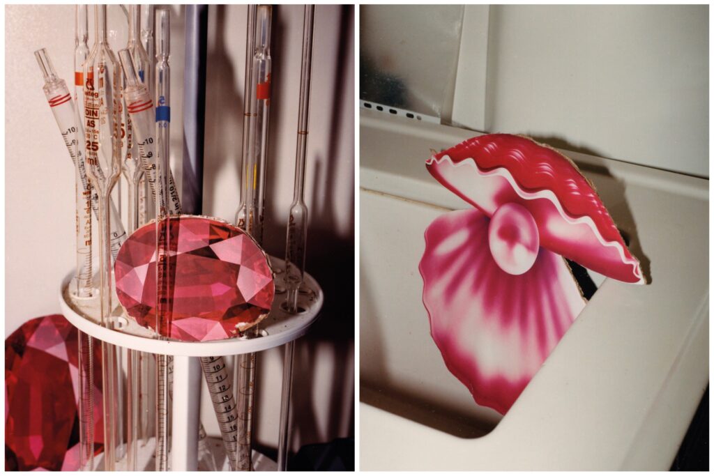 Nella mostra “Rosa Sentinella” Rachele Maistrello gioca con gli spazi dell’azienda vitivinicola Zenato, che diventa un playground dove poter installare le sue piccole “meraviglie” di cartone. In questa serie di fotografie analogiche, forme semplici, come ciliegie, perline, ponti di cristallo, conchiglie fuoriscala, appaiono tra gli strumenti di produzione del vino, con una cromia porpora che si avvicina all’uva che dà vita all’azienda Zenato, dove l’artista è stata in residenza nel 2023.