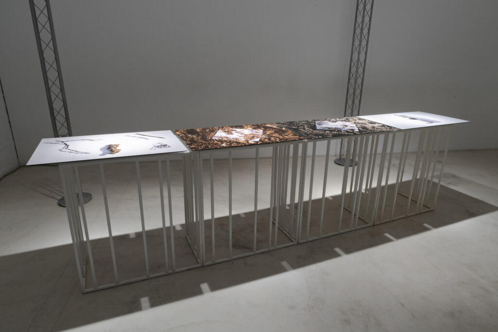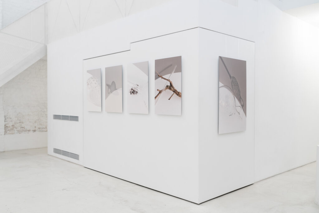Il lavoro di Anna Vezzosi verte sul concetto di origine. La bottiglia del 1973 rappresenta la tradizione, il desiderio di Sergio Zenato nel valorizzare le potenzialità ancora inespresse del vitigno autoctono Trebbiano di Lugana. La presenza della terra nelle immagini è un chiaro rifermento a ciò che si genera, alla fatica dell’uomo, alla cultura del luogo. Poi compaiono elementi naturali derivanti dal vigneto, raccolti e presentati dall’autrice come reperti archeologici, appartenenti ad un tempo arcaico. Simbolo dell’evoluzione della pianta, studiata con molta precisione e attenzione per produrre un vino di qualità e in continua evoluzione. Questi materiali rimandano alla nascita dell’azienda che coincide con la conoscenza profonda del territorio e dei prodotti, un punto in cui storia naturale e umana si incontrano costantemente. La presenza ripetuta della carta millimetrata rappresenta per Vezzosi la precisione scientifica che si respira in azienda e la cura necessaria a una produzione di alta qualità. L’unica fotografia verticale della serie è lì a indicare il punto di origine, dove la pianta e il terreno si incontrano. Sintesi della costruzione di tutti i progetti evolutivi, passati e futuri, legati ai vini Zenato. Il punto bianco definisce il luogo in cui le fondamenta (radici) iniziano a divenire architettura (albero), il punto in cui le idee si trasformano in progetti.