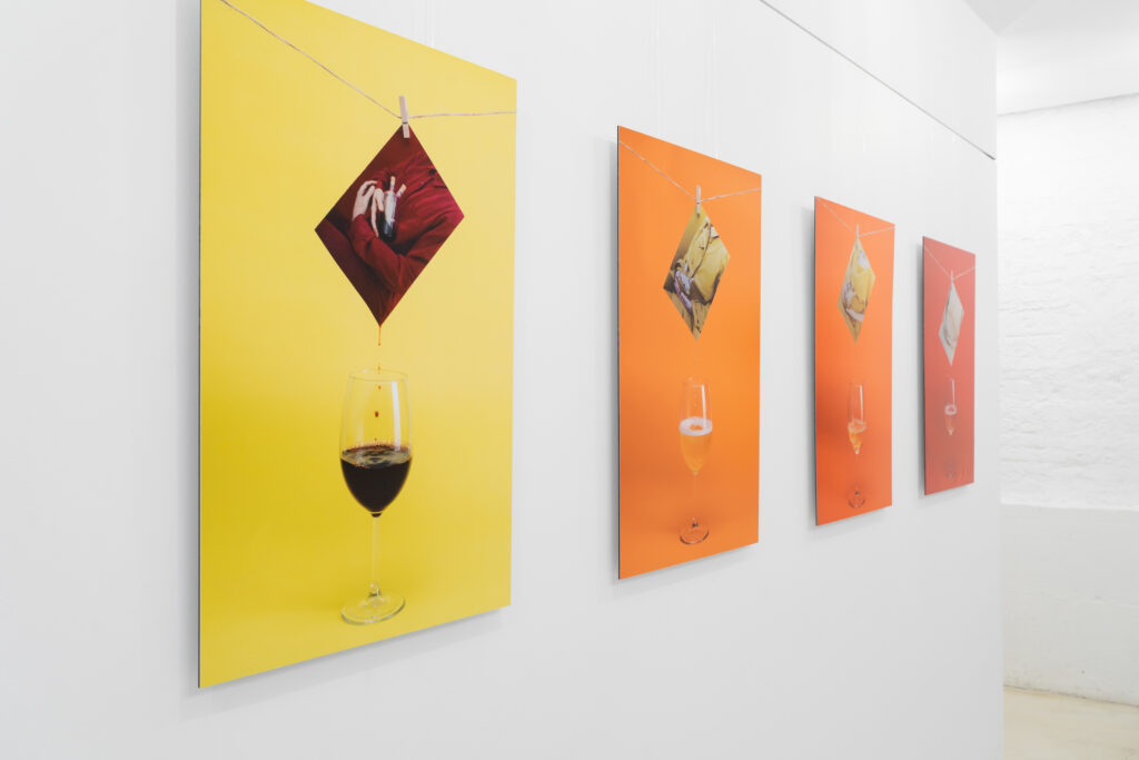 All’interno delle cantine, ogni vino Zenato segue un particolare percorso di lavorazione, per svelare tutta la sua essenza al momento della degustazione. L’olfatto, il gusto e la vista sono i sensi direttamente coinvolti nell’esperienza del vino. Cecilia Del Gatto, muovendosi nell’ambito delle arti visive, non può che privilegiare la vista nell’indagine fotografica che è chiamata a realizzare. Il colore è l’aspetto più evidente se parliamo di visivo e le differenti gamme cromatiche del vino sono ciò che più solletica lo sguardo. L’autrice crea un ponte tra il suo mondo di appartenenza, l’arte, e la produzione dell’azienda vitivinicola. L’azione del mescere, cioè del versare nel bicchiere, diviene il collante tra due differenti ambienti, dove la gradazione cromatica è un ulteriore punto di unione. Le cinque immagini mostrano ciascuna una fotografia appesa a un filo, come accade in camera oscura, ogni fotografia si distingue per una rappresentazione che ricorda l’iconografia pittorica dell’arte rinascimentale. Un corpo di donna, senza volto, in posa ieratica, custodisce con devozione il nettare degli Dei che, dalla fotografia appesa, viene versato nel bicchiere in primo piano. Del Gatto suggerisce metaforicamente lo stretto legame che unisce la sacralità della tradizione pittorica italiana, con le caratteristiche “estetiche” del vino: limpidezza, trasparenza, fluidità, colore.